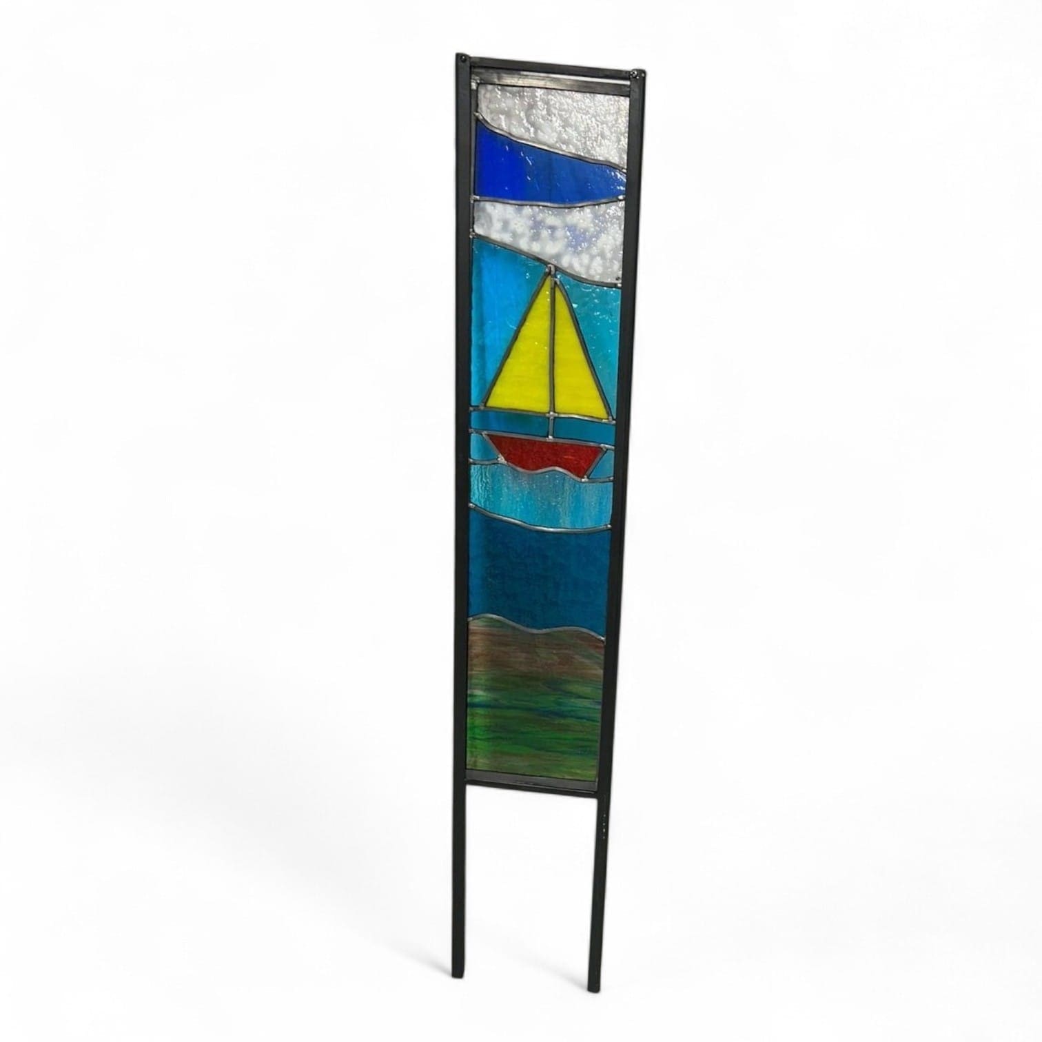 This leaded glass panel features a sailing scene in layered blue tones with a bright yellow sail, creating a strong vertical feature suited to gardens and outdoor spaces. Textured glass has been used throughout to allow light to pass through while adding depth and movement.